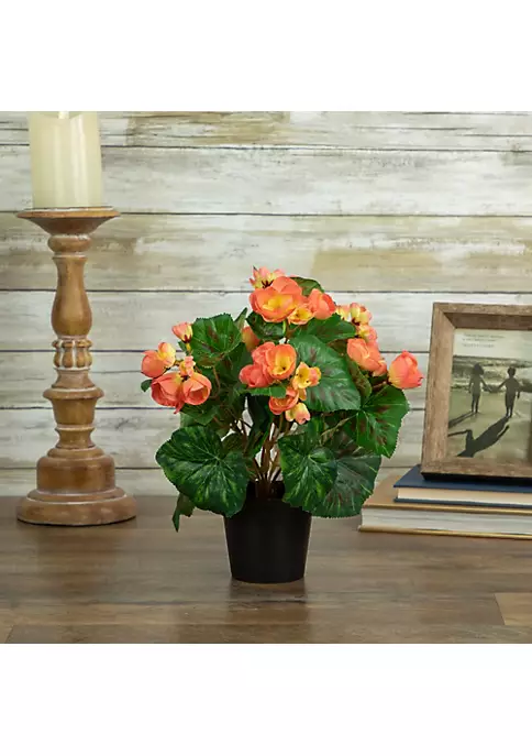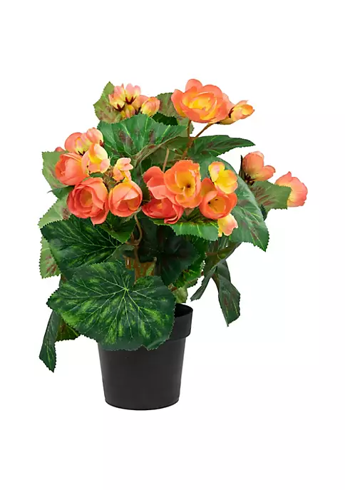 Perfectly replicated artificial silk begonia flowers are a great way to keep your environment warm cozy and welcoming throughout the year. This stunning arrangement features radiant peachy coral blooms that sit upon green leaves. The plant comes potted in a sturdy black plastic pot with faux dirt for a realistic look. Easily maintained this artificial flora is perfect for your home or office.