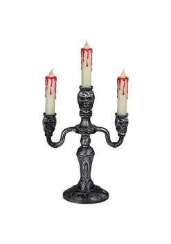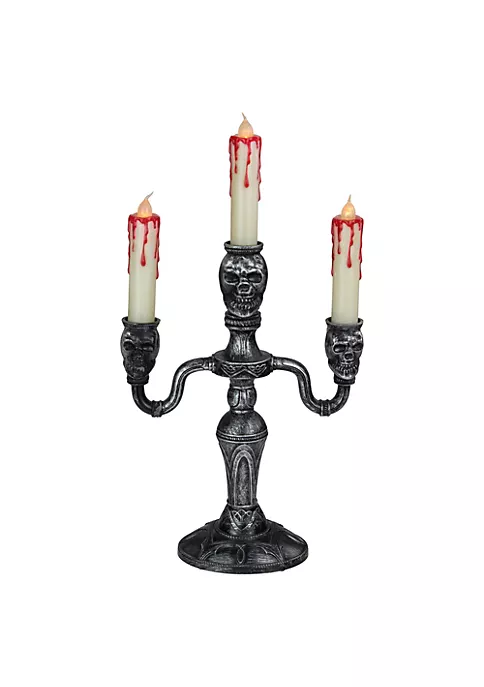 Create a perfect mysterious and slightly spooky atmosphere with this skull candelabra. This candlestick has 3 skeleton heads with flameless LED candles. The candles are white with a dripping red wax accent and the bulb is a flickering amber color. It would be perfect to display on a mantle windowsill or on a tabletop.