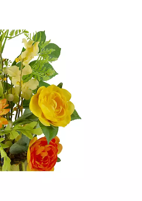 Add bright pops of color to your home with our life-like artificial ranunculus and rose flower pot. Featuring realistic silk flowers in a unique wooden pot what better way to welcome guests and spring to your home.