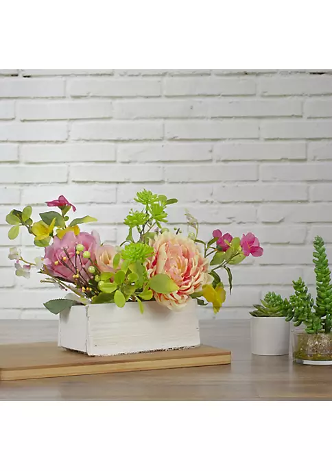 This rustic wood planter box adds a touch of nature with pops of color to your decor. This beautiful arrangement features a pink blush peony pink and yellow roses and realistic foliage. Place in your home or office or give as a long lasting gift to a loved one.
