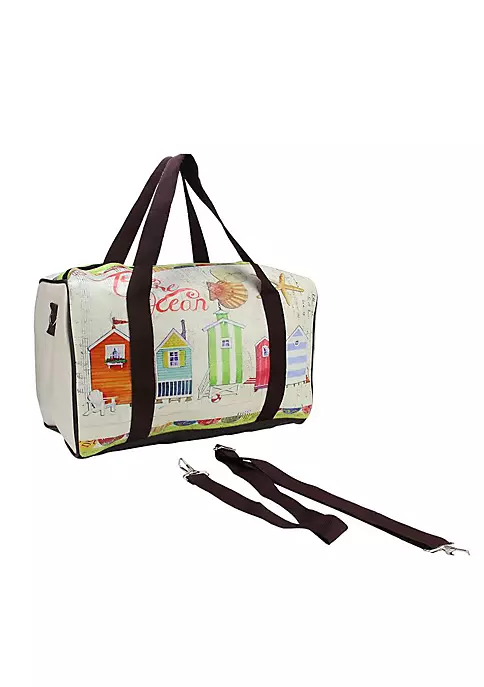 Travel in style with this rectangular vintage-style travel bag featuring multicolored beach houses seashells and starfish