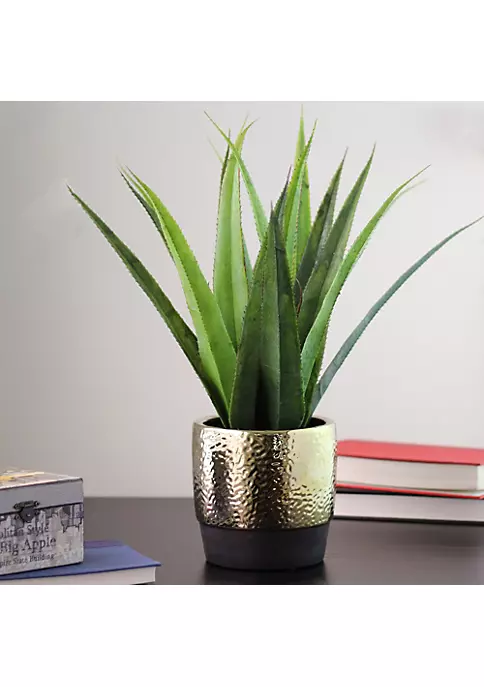 Extremely realistic plant is nestled in a gold plated dimpled ceramic pot