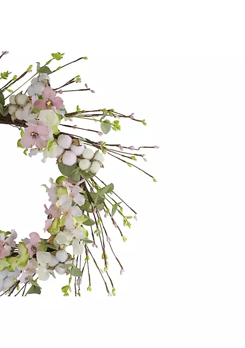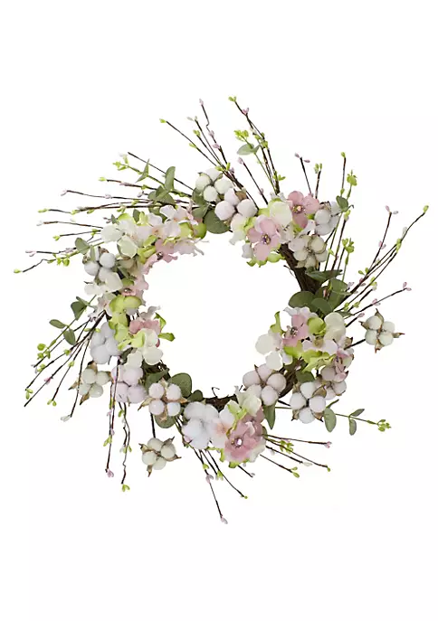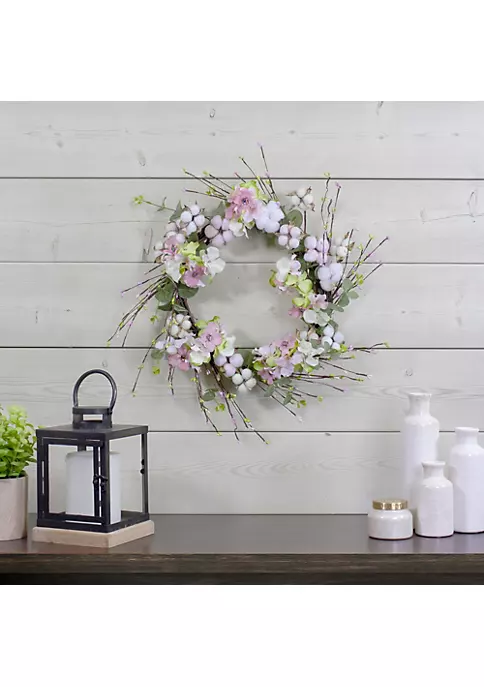 This Spring wreath is so unique displaying hydrangeas and cotton together. Just the right amount of glitter adds sparkle. Perfect for doors walls or as part of your Easter table centerpiece.