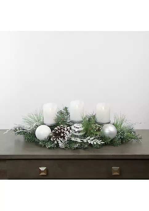 This festive Christmas candle holder would be the perfect addition to your winter holiday decor. Adding a touch of winter’s nature and some sparkle with frosted pinecones and glittered leaf sprigs. Place up to three pillar candles to display on mantles or as a centerpieces