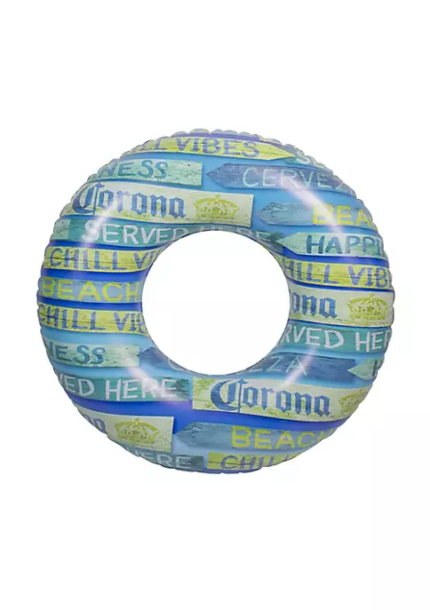Features traditional Corona colors and logo with the words beach chill vibes happy and more