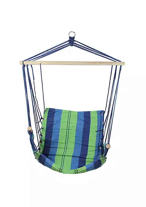 This hanging chair would be a vibrant addition to your outdoor living space. Stay comfy in your outdoor space in this padded hammock chair that features armrests a pillow and a striped multi-color design perfect for any outdoor space. This fun hammock is easily transported and hung where ever you venture!