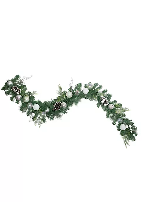 With the hustle and bustle of the holiday season you may not have enough time to fully decorate your home. This lovely pre-decorated garland will make this year’s decorating a breeze. Adding a touch of winter’s nature and some sparkle with frosted pinecones textured and shiny ornaments and berries. Perfect for hanging on mantles over thresholds or along stairwells.