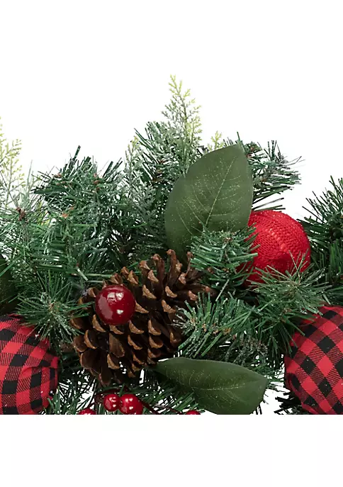 A plaid and pinecone designed bow complete the wreath