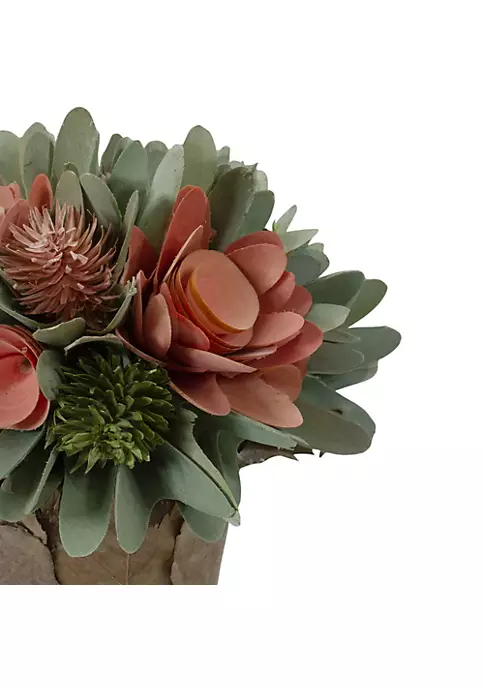 With spring right around the corner this adorable unique arrangement is the perfect way to welcome in the new season. The potted arrangement is beautifully constructed of wooden flowers and foliage nestled inside of a pot made from dried leaves. This potted flower arrangement will be the perfect centerpiece all Spring long.