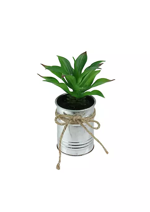 Foliage nestled in a silver tin planter with twine bow
