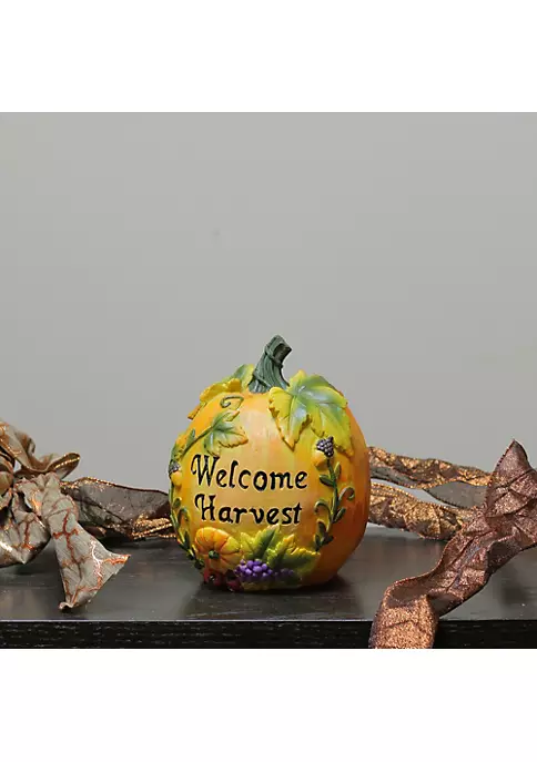Capture the feeling of a crisp fall day with this beautiful pumpkin decoration. This orange pumpkin comes with painted accents and features the saying “Welcome Harvest”. This will be the perfect addition to your mantle shelves tabletop or anywhere you wish to add a little holiday cheer.
