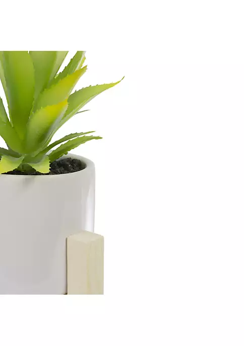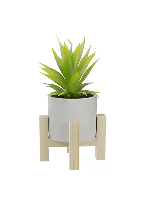 Don’t let your brown thumb hold you back. Show off your love of plants with this artificial agave arrangement. This faux agave plant is held in a white ceramic pot that is nestled on a wooden stand. This plant is set inside of faux dirt and stone for a realistic look. Easily maintained this artificialplant is perfect for your home or office.