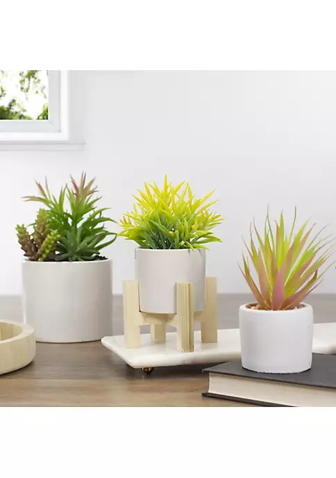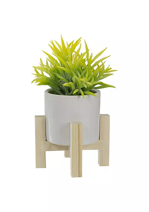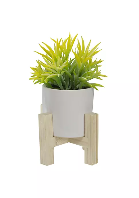 Succulents have become a growing trend as they are easy to care for and require little attention. This artificial succulent arrangement is even better as it looks real but requires no maintence. The green succulent is nestled inside of white ceramic pot on a wooden stand. Grab yourself one or two of these succulents today to add some character to your home or office.