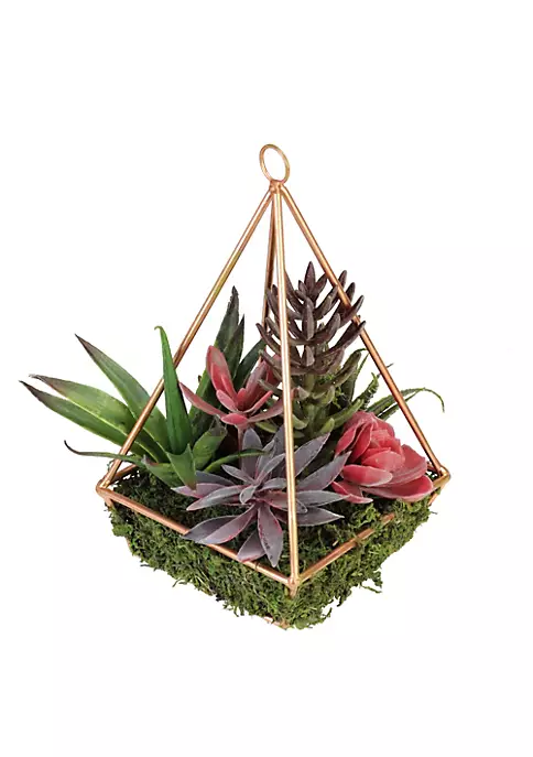 Don’t let your brown thumb hold you back. Show off your love of plants with this beautiful intriguing artificial succulent. Encased in a metal geometric frame this piece is sure to give your decor a charismatic look. Easily maintained this artificial succulent is perfect for your home or office.