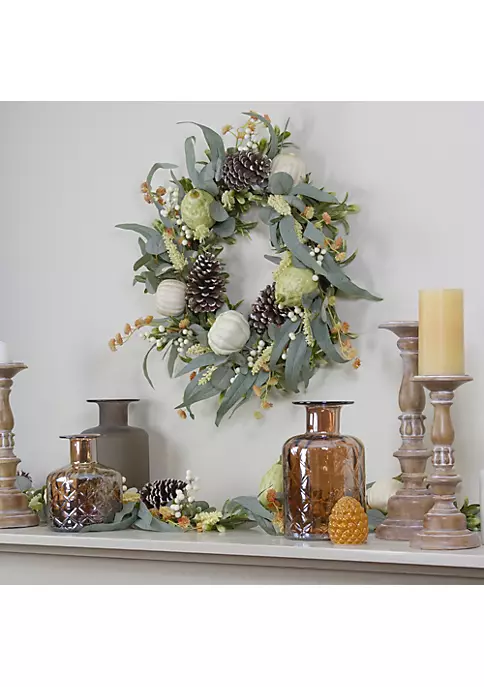 This gorgeous harvest wreath provides all the wonderful feelings of Autumn. A mix of verdant foliage is the backdrop for berries gourds and pine cones. Perfect for hanging or used as part of your Thanksgiving table centerpiece.