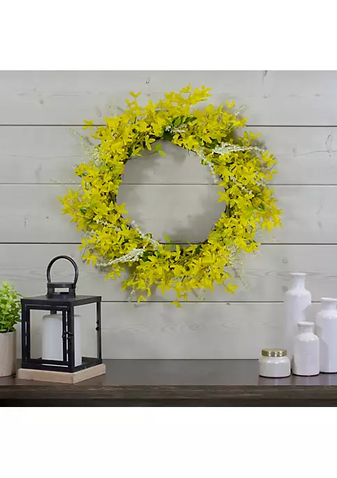 Add a touch of spring to your decor with this blossoming Jasmine wreath. Petite yellow flowers are arranged on a circular twig grapevine. Hang anywhere in your home or office or use as a centerpiece with your favorite candle in the center.