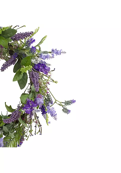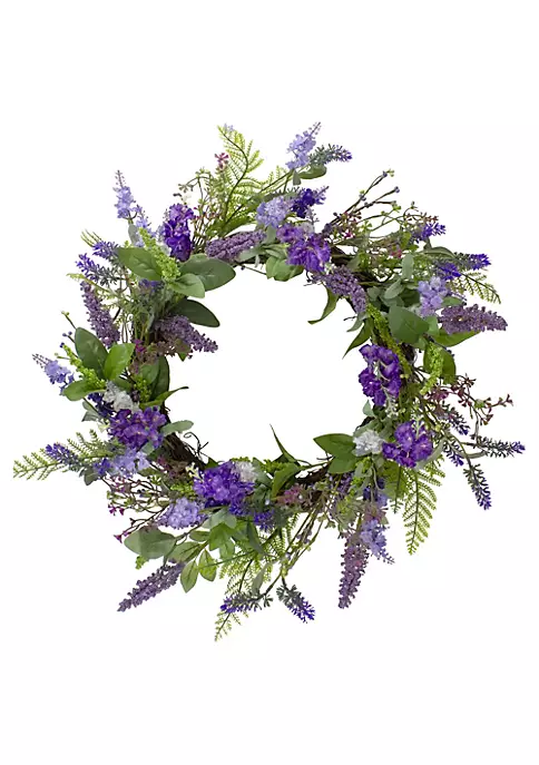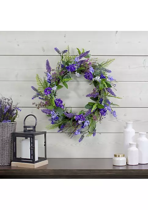 Add a touch of spring to your decor with this blossoming lavender wreath. A variety of purple flowers are arranged on a circular twig grapevine. Hang anywhere in your home or office or use as a centerpiece with your favorite candle in the center.