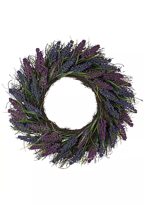 The range of purples makes this realistic wreath suitable to be displayed from the joyous start of spring until the sorrowful end of summer. Delicate patches of lavender contrast wonderfully with the brown twigs that just peek out from behind the foliage. Hang on any wall or door in your home or office to accent your already existing decor.