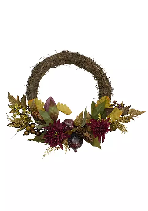 Accented with mums acorns pine cones pomegranates berries and leaves at the base of the wreath