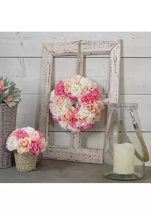 With spring right around the corner this adorable unique wreath is the perfect way to welcome in the new season. The wreath is beautifully constructed of peonies in shades of pink and white making this perfect for several occasions. You can place this on any wall or door in your home or simply lay flat on a surface for the perfect centerpiece just add a vase or candle. Welcome the warmer weather and grab yourself a new wreath today!