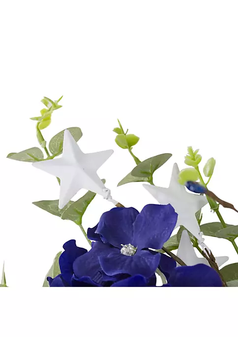 Show your patriotism in a fun and unique way with this Americana wreath. Red white and blue hydrangeas are nestled in with eucalyptus leaves and small white stars. Perfect on doors walls or as part of your patriotic centerpiece.