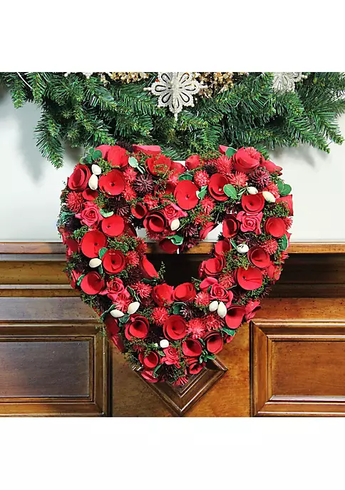 This unique wreath will warm your heart this Valentine’s Day. Shaved wood roses nuts and silk flowers make up this beautiful heart-shaped wreath. Strategically placed green foliage pops against the deep red color.
